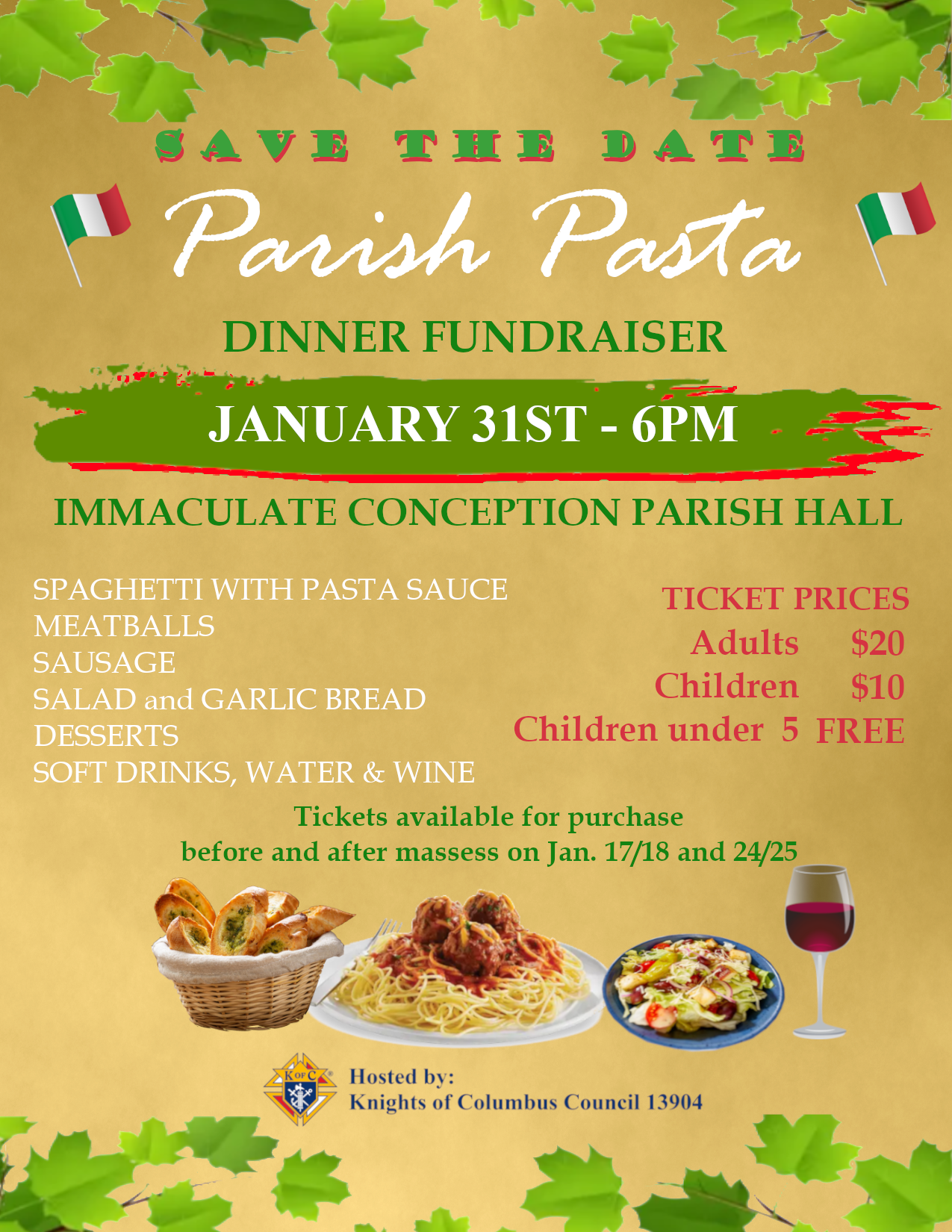 The Knights of Columbus are hosting a Parish Pasta Dinner in the parish hall on Saturday January 31st, following the 5:00pm Mass. Please join us to shake off the winter blues and enjoy a warm meal and the warm company of your fellow parishioners! The dinner will cost $20 for Adults and $10 for Children 5-18, and is limited to 180 participants. Tickets will be sold in advance on the weekends of January 17/18 and January 24/25 after all Masses.